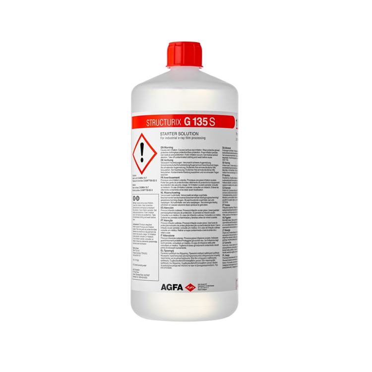 Серия, предназначенная для автоматической обработки плёнки: проявитель Agfa G135, стартер Agfa G135-S, фиксаж Agfa G335.В случае сильного загрязнения используйте специальные фирменные чистящие агенты: Agfa NDT DEVCLEAN для зоны проявителя и Agfa NDT FIXCLEAN для зон фиксажа и промывки.