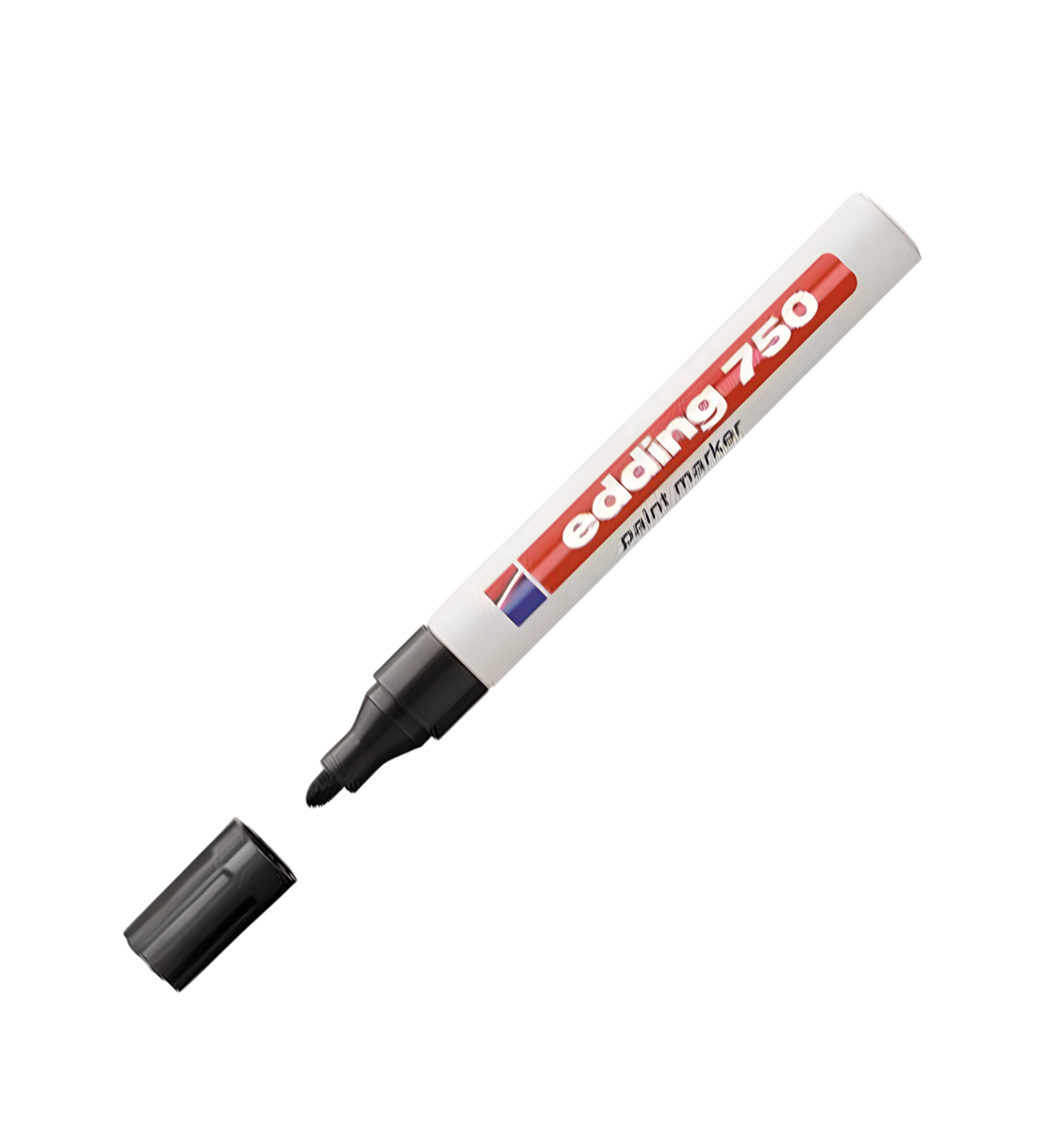 Универсальный маркер Edding 750, используется для промышленной непрозрачной маркировки практически всех материалов, например, стекла, пластика, дерева или металла. Может применяется для письма на жирных, пыльных, грязных поверхностях. Лаковый маркер устойчив к кислотам, растворителям, механическому истиранию, свету. Высококонцентрированный пигмент хорошо ложится на гладкие и шероховатые поверхности. Специальные добавки, введенные в состав маркера Edding E 750 растворяют, масляную пленку на поверхности письма. Непрозрачные лаковые чернила позволяют делать хорошо заметные надписи густым плотным слоем даже на темных поверхностях. Корпус промышленного маркера изготовлен из алюминия. Маркер Edding E 750 имеет упроченный круглый (пулевидный) наконечник. Наконечник маркера может быть заменен по мере истирания. Благодаря тонкому наконечнику, маркером может наноситься маркировка на небольшие элементы и поверхности. Толщина линии — 2-4 мм. Поток чернил регулируется клапаном. Чернила маркера с лакирующим эффектом на основе нитрокраски. Водостойкий, быстро сохнет. Термостойкость надписи до 1000 градусов по Цельсию. Надписи цветами 06-010, 049, 054 также видимы до 1000 С. Термостойкость остальных цветов — до 400 градусов по Цельсию. Маркер Edding E 750 хорошо зарекомендовал себя в работе при перепадах температур от −15 до 30. Промышленный лаковый маркер Edding Е-750 универсален. Используется, например, при нанесении меток на разнородные материалы. При маркировке изделий из резины, пластика, стекла, металла, кабеля, проводов, при нанесении маркировки на товары достаточно одного маркера — Edding E 750. Идеально подходит для маркировки грузов, приборостроения, технологической маркировки. Кроме того, маркер Edding E 750, благодаря разнообразной палитре цветов и свойствам красящего вещества, широко используется для декоративных и оформительских работ дизайнерами. используется в витражных работах, росписи по дереву и керамике, для других интерьерных работ. Инструкция по применению маркера: 1. Перед использованием хорошенько встряхнуть с закрытым колпачком. 2. Снимите колпачок, прижмите наконечник к поверхности, надавите и удерживайте пока не проступит краска. 3. Применять после того как убедитесь, что вытекает исходный цвет. Предостережение: плотно закрывайте колпачок после применения, держать маркер вдали от огня и прямых солнечных лучей.